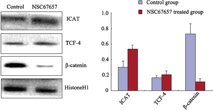Figure 3: Nuclear protein levels of ICAT, β-catenin, and TCF-4 during NSC67657-induced monocytic differentiation. HL60 cells were treated with 10 μM NSC67657 for 5 d and nuclear proteins extracted and subjected to western blotting. In control samples, normal culture medium was added without drug and nuclear proteins extracted using the same procedures. Nuclear levels of ICAT protein in the NSC67657 treated group (0.58±0.05) were significantly higher than in the control group (0.31±0.07) (P=0.001). There was no difference (P=0.16) in nuclear TCF-4 protein levels in the treated (0.24±0.04) and control (0.19±0.02) groups. Nuclear β-catenin protein levels in the treated group (0.13±0.04) were significantly lower than in the control group (0.68±0.12) (P=0.001).