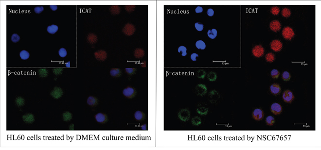 Previous studies have indicated that ICAT inhibition affects the β-catenin/TCF4 interaction and the downstream target genes in other tumor types. However, the ICAT/β-catenin signaling in acute myeloid leukemia cells remains incompletely understood. In addition, it remains unknown whether the Wnt/β-catenin signaling participates in the NSC67657-induced monocytic differentiation of acute promyelocytic leukemia cells.