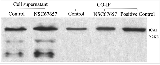 Figure 5: ICAT and β-catenin interaction analyzed by co-IP during NSC67657-induced monocytic differentiation. The figure shows data from NSC67657 treated and control cells, collected in the logarithmic growth phase with cell concentrations adjusted to 1 × 106 cells/ml. The prerequisite for success of this experiment was the presence of target protein in the supernatant of the cell lysates. With equivalent protein loading, the extent of protein–protein interaction could be estimated by densitometry. We found that the HL60 cells treated with NSC67657 had darker ICAT protein bands than the control group. This confirmed the presence of an interaction between β-catenin and ICAT proteins and that this interaction was increased with the drug treatment.