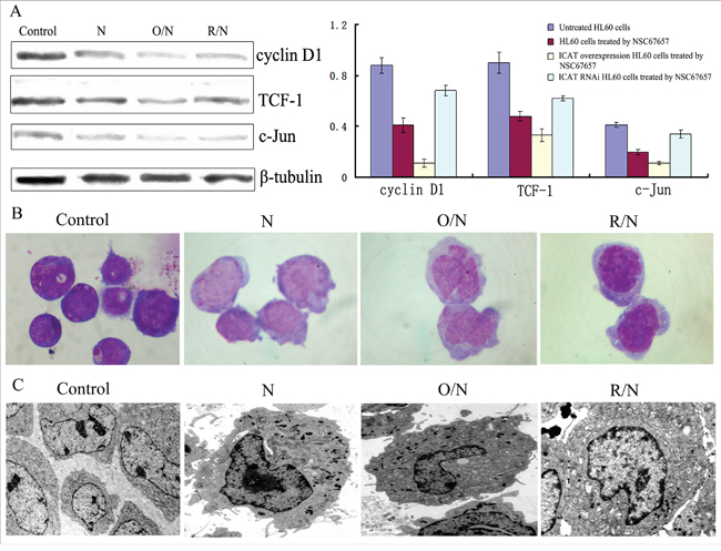 Figure 6: Effect of ICAT on NSC67657-induced monocytic differentiation. The figure shows untreated HL60 cells (Control), NSC67657 treated cells (N), NSC67657 treated ICAT-overexpressing cells (O/N) and NSC67657 treated ICAT-silenced cells (R/N). (A) After 24 h drug treatment, levels of proteins related to the Wnt signaling pathway were lower in ICAT overexpressing models (P=0.02), but higher in ICAT-silenced models, compared to drug-treated normal cells (P=0.01). (B) Cellular morphology of drug treatment groups were observed using Wright's staining. The cytoplasm of drug treated normal HL60 cells was shallow, with protuberant pseudopodia and irregular edges and the nucleus was kidney-shaped. In ICAT-overexpressing HL60 cells, however, there were large cell bodies and more cytoplasm and a visibly irregular nuclear morphology, compared with in other treatment groups. In ICAT-silenced HL60 cells, the cytoplasm had a darker color and the nuclei were not significantly changed, but still immature. (C) Various groups of HL60 cells were treated with 10 μM NSC67657 for 24 h and ultrastructural observation (10,000×) conducted. Chromatin thickening and margination occurred in all drug-treated groups. Obvious azurophilic granules were present in ICAT-overexpressing cells, and there were also irregular nuclei, heterochromatic margination and swollen mitochondria. In addition, these cells showed significantly inhibited proliferation and a trend toward myeloid differentiation.