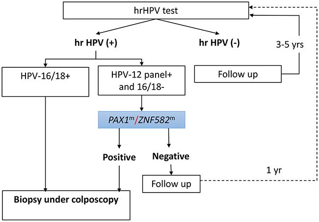 We recommend a new hrHPV flow-chart procedure for primary screening for cervical cancer. Our study suggests that the dual methylated markers, PAX1m and ZNF582m, combined with HPV-16/18 testing, could help to reduce the number of hrHPV- positive women being referred for colposcopy. Furthermore, implementation of our recommendations could simplify the logistics of follow-up care, especially in regions where colposcopy is not readily available. We propose that the suggested approach would be useful in outpatient departments of hospitals in highly populated countries where screening is not readily accessible through community-based settings.