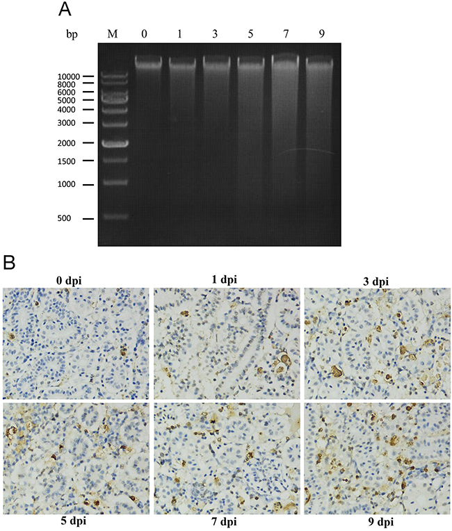 Figure 1: GCRV induced apoptosis in grass carp. (A) DNA ladder assay confirmed the apoptosis in grass carp induced by GCRV. Spleen samples were collected from grass carp before (0 day) and after (1, 3, 5, 7, and 9 days) GCRV infection. DNA was extracted and subjected to electrophoresis in 1% agarose gel. M: DNA molecular weight marker. (B) TUNEL assay confirmed the GCRV induced apoptosis in grass carp. Kidney samples were collected from grass carp before (0 day) and after (1, 3, 5, 7, and 9 days) GCRV infection and subjected to TUNEL assay. The blue stains indicate the normal cells while the brown stains represent the apoptotic cells. The figure showed the apoptosis rate was increased after GCRV infection. Magnification: 400×.