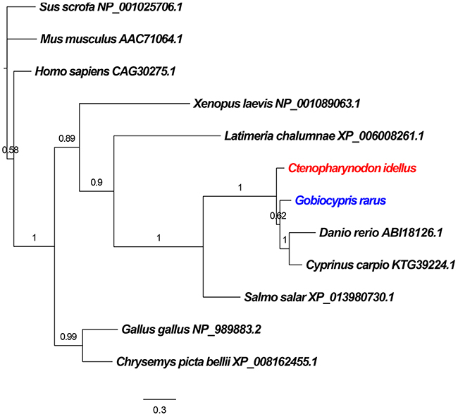 Rare minnows were raised and maintained under standard laboratory conditions at China Zebrafish Resource Center (CZRC, http://en.zfish.cn/). Embryos of rare minnow were cultured in 10 cm petri dishes at 28 °C. Adult rare minnows were maintained in the standard tank of an automatic fish housing system. Healthy 4-5 months old adult female and male fish were maintained in separated tanks and mated once a week to obtain progeny. Five mature rare minnows were obtained and RNA from gill, intestine, liver, spleen, middle kidney, head kidney, muscle, heart, and brain were prepared to amplification the cDNA sequence of GrBid.