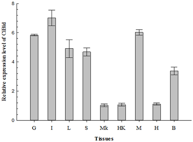 Figure 3: qRT-PCR analysis of the expression level of CiBid in different tissues of grass carp. β-actin was used as an internal control for real-time PCR. The relative expression level was the ratio of gene expression level in different tissues relative to that in the middle kidney. G, Gill; I, Intestine; L, Liver; S, Spleen; MK, Middle Kidney; HK, Head Kidney; M, Muscle; H, Heart; B, Brain.
