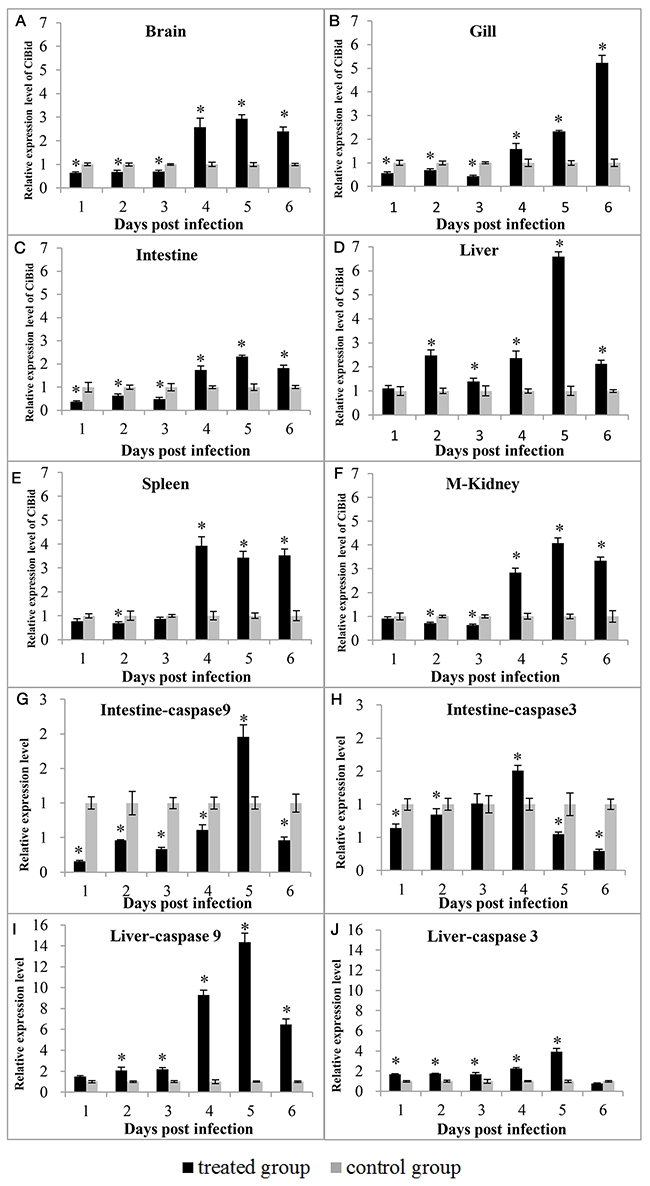 Figure 4: Expression patterns of CiBid (A, B, C, D, E, and F), CiCaspase-9 (G and I) and CiCaspase-3 (H and J) in different tissues after GCRV infection. The relative expression level was the ratio of gene expression level in treated group relative to that in the negative control group in the same tissue normalized to the β-actin gene. Significant difference (p<0.05) between the control and treated group is indicated by asterisks (*).