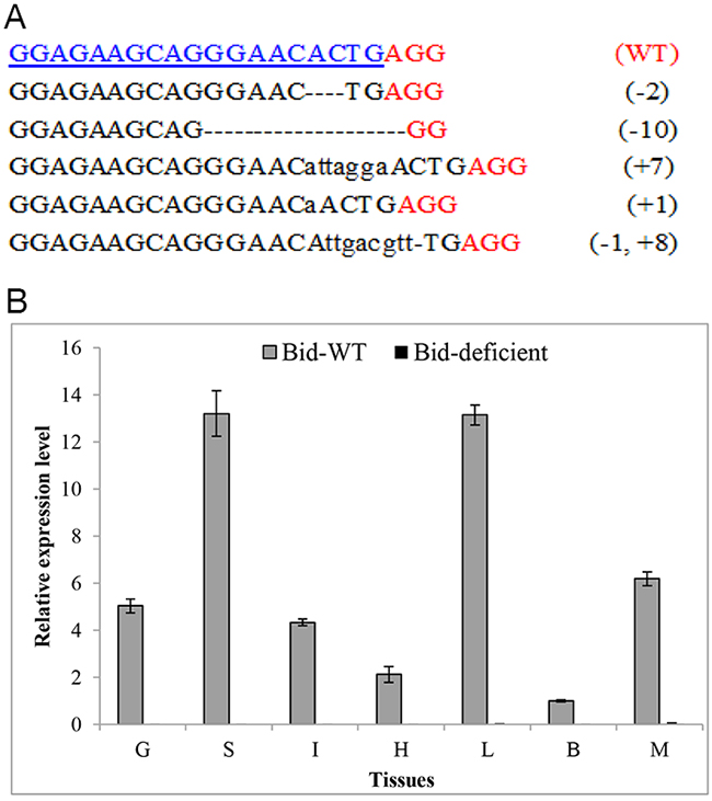 Figure 5: Efficient disruption of rare minnow Bid gene by CRISPR/Cas9. (A) Multiple mutations induced by CRISPR/Cas9 system in the target sequence. Numbers to the right of the targeting sequences indicated the loss or insert of bases for each allele, with the number of bases inserted (+) and deleted (-) indicated in parentheses. Deletions were shown as black dashes and insertions as lower case letters. The wild-type (WT) sequence was shown at the top with the target site highlighted in blue and the PAM sequence highlighted as red underlined text. (B) Confirm the loss of Bid expression level by RT-qPCR. β-actin was used as an internal control for RT-qPCR. The relative expression level was the ratio of gene expression level in different tissues relative to that in the brain tissue from the wild-type fish. G, Gill; S, Spleen; I, Intestine; H, Heart; L, Liver; B, Brain; M, Muscle.