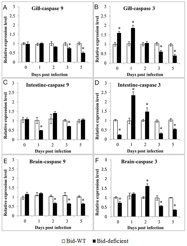 In order to investigate whether the delay of death in Bid-deficient rare minnow was attributed to the degree of virus-triggered apoptosis, the differences in expression level of apoptosis related genes between Bid-deficient and wild-type rare minnow were compared. As shown in Figure 8, overall, at the 3 and 5 dpi, the expression level of GrCaspase-9 and GrCaspase-3 in gill, intestine and brain of Bid-deficient rare minnow were significantly lower than those in the wild-type fish (Figure 8). Specifically, as for GrCaspase-3, the relative expression level in gill, intestine and brain of Bid-deficient rare minnow were even notably higher than these in wild-type group at 0, 1, or 2 dpi; however, the expression level were significantly lower in Bid-deficient rare minnow at 3 and 5 dpi (p<0.05; Figure 8B, 8D, and 8F). In comparison with wild-type rare minnow, the expression of GrCaspase-9 in gill, intestine and brain of Bid-deficient rare minnow displayed significantly lower level at 2, 3 or 5 dpi (p<0.05; Figure 8A, 8C, and 8E). These data suggested that GCRV-induced apoptosis in rare minnow was diminished in the absence of Bid.