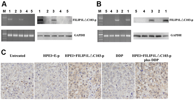 Figure 1: Expression of FILIP1LΔC103-p in vitro and in vivo (A) identification of the expression of FILIP1LΔC103-p in transfected SKOV3 cells in vitro by RT-PCR and Western Blot analysis. SKOV3 ovarian cancer cells were treated with HPEI+FILIP1LΔC103-p plus DDP (1), DDP (2), HPEI+FILIP1LΔC103-p complexes (3), HPEI+E-p complexes (4), or 5% GS (5) respectively. On the left, RT-PCR indicated only HPEI+FILIP1LΔC103-p complexes treated cells(Lane 1 and 3) had a positive band of FILIP1LΔC103-p (2370 bp). GAPDH was used as the internal standard. On the right, the result of Western Blot showed positive band (~100 kDa) only occurring in cells transfected with HPEI+FILIP1LΔC103-p complexes in contrast to control groups. (B) Expression of FILIP1LΔC103 in vivo. The intraperitoneal carcinomatosis model in nude mice was established and intraperitoneally administered with HPEI+FILIP1LΔC103-p plus DDP (1), DDP (2), HPEI+FILIP1LΔC103-p complexes (3), HPEI+E-p complexes (4), or 5% GS (5) respectively. (C) Immuno-staining of FILIP1LΔC103 in tumor tissue, original magnification ×400.