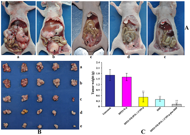 To evaluate the tumor suppressor function of HPEI+FILIP1LΔC103-p plus DDP combination treat-ment in vivo, a human ovarian cancer intraperitoneal xenograft model was established. Nude mice in the five groups were treated as aforementioned, and then euthanized at the cessation of animal experiment. As shown in Figure 2, the group that undergone therapy with HPEI+FILIP1LΔC103-p or DDP alone exhibited effective inhibition of tumor growth (mean tumor weight, 0.51±0.25 g, and 0.38±0.11 g, respectively). The growth of tumor observed in the two groups were inhibited significantly when compared against the two control group treated with 5% GS and HPEI+E-p (mean tumor weight, 1.71±0.31 g, and 1.61±0.19 g, respectively, p<0.01). However, the combination therapy group (mean tumor weight, 0.13±0.04g) exhibited an augmented effect on tumor suppression when compared with the two control group treated with HPEI+FILIP1LΔC103-p and DDP alone (P<0.01, Figure 2B and 2C).
