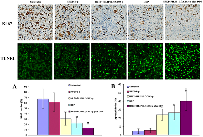 Figure 4: Effect of the combination treatment on cell proliferation and apoptosis in vivo. (A) The significant suppression of cell proliferation was detected in the HPEI+FILIP1LΔC103-p or DDP single treatment groups. Many Ki-67-positive cells were identified in the untreated and HPEI+FILIP1LΔC103-p groups, but only a few positive nuclei occurred in HPEI+FILIP1LΔC103-p plus DDP group. (B) Apoptotic cells could be observed in tumors treated with HPEI+FILIP1LΔC103-p or DDP alone. Combination therapy obviously increased the percentage of apoptotic cells versus controls. Data are shown as Means ± SE. **p<0.01 versus untreated group; ++p<0.01 versus HPEI+FILIP1LΔC103-p group.