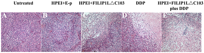 Figure 5: Histological analysis of tumors. Tumor tissues from the untreated group (A) and HPEI+E-p group (B) had large areas of confluent tumor cells with little or no tumor tissue necrosis. Tumors with distinct necrosis were shown in HPEI+FILIP1LΔC103-p (C), DDP (D), and HPEI+FILIP1LΔC103-p plus DDP groups (E), respectively. Representative sections of tumor tissue in each treatment group were depicted at ×200 magnification.