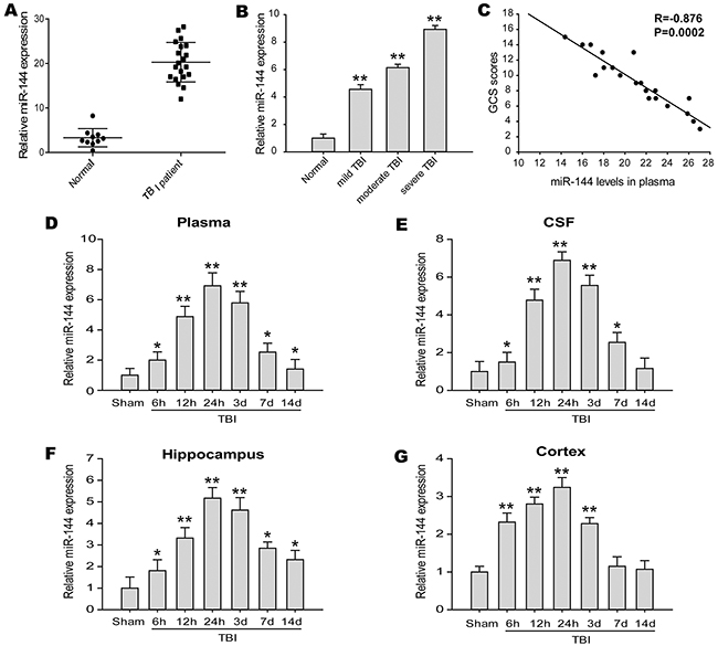 Plasma miR-144 was up-regulated in TBI patients and correlated with clinical parameters