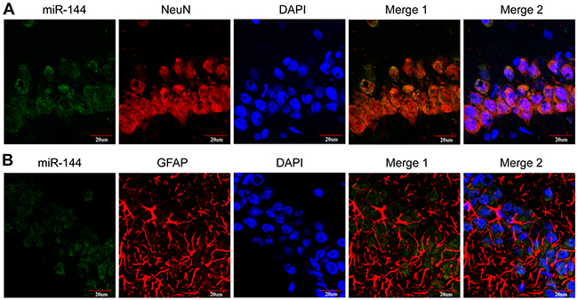 Figure 2: Representative images of the immunostaining of in-situ miR-144 expressed by neurons (A) and astrocytes (B) in the hippocampus CA1 region. These were measured by immunofluorescence staining and observed under the confocal laser scanning microscope. Scale bars: 20 mm.