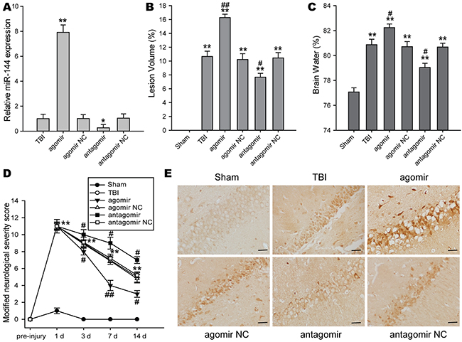 To investigate the roles of miR-144 in exprimental TBI rats, miR-144 agomir, antagomir, and their negative control were respectively injected into the lateral ventricle of rats following TBI. 48 h after the injection, the transfection efficiency of miR-144 in the hippocampus of rats was confirmed using real-time PCR (Figure 3A). The protective effects of miR-144 on brain injury were also evaluated by assessment of cortical lesion volume, brain edema, and the modified neurological severity score(mNSS) at different time-points after TBI, which were a surrogate marker for the histopathological outcome that impacted the cognitive dysfunction. The lesion volume and brain edema was reduced in TBI rats treated with miR-144 antagomir, whereas miR-144 agomir administration aggravated lesion volume and brain edema as compared to untreated TBI rats (Figure 3B and 3C). For the mNSS test, no difference in the neurological score was observed in rats injected with miR-144 agomir and antagomir at 1 d post-TBI. Compared with TBI group, mNSS score was increased in the miR-144 antagomir group and decreased in the miR-144 agomir group at 3 d, 7 d and 14 d post-TBI (Figure 3D). In addition, neuronal damage of hippocampus after TBI were assessed by immunohistochemical staining of apoptotic marker casepase 3. The result showed that miR-144 agomir aggravated neuronal death, whereas miR-144 antagomir attenuated neuronal injury (Figure 3E). Taken together, these results demonstrated that inhibition of miR-144 could decrease lesion volume, alleviate brain edema, and improve neurological deficit and histological outcome, suggesting effective neuroprotection of miR-144 knockdown against brain injury in TBI rats.