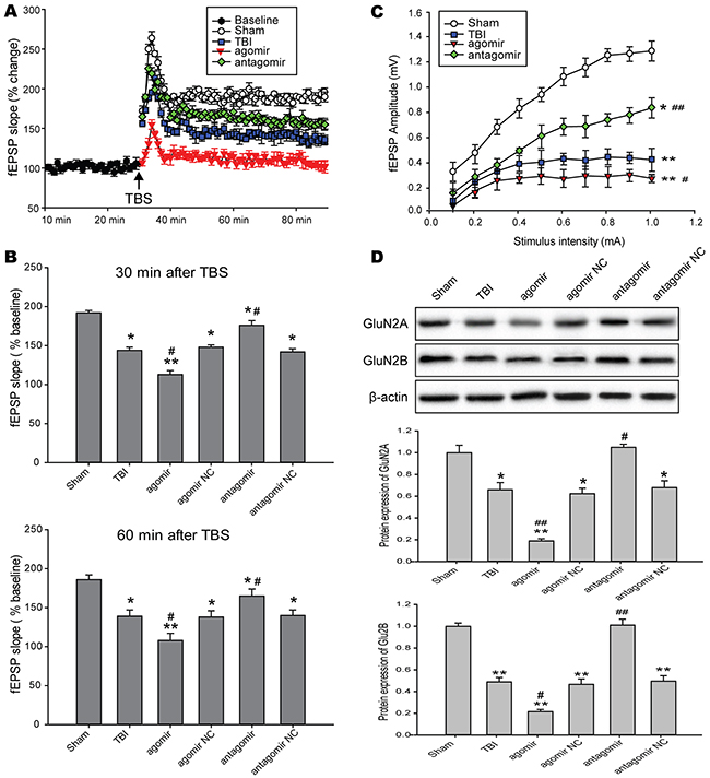 Figure 5: Effects of regulating brain miR-144 on LTP in NMDAR-dependent in rat hippocampal slices following TBI. (A) The slope values of fEPSPs were analyzed for quantization of the responses. After 30 min of baseline recording of fEPSPs, TBS was applied and then the responses were measured for 60 min after TBS. (B) Histograme representing the average percentage LTP calculated using slopes of evoked responses at 30 min and 60 min after LTP induction. (C) The input-output (I-O) curves by the stimulation current intensity adjusted from 0 to 1 mA. (D). Representative bands and quantitative analysis of NMDAR subunits in the hippocampal CA1 region of TBI rats in each group. The data are expressed as mean ± SD. *P< 0.05, **P< 0.01 versus the sham group, #P< 0.05, ##P< 0.01 versus the TBI group.