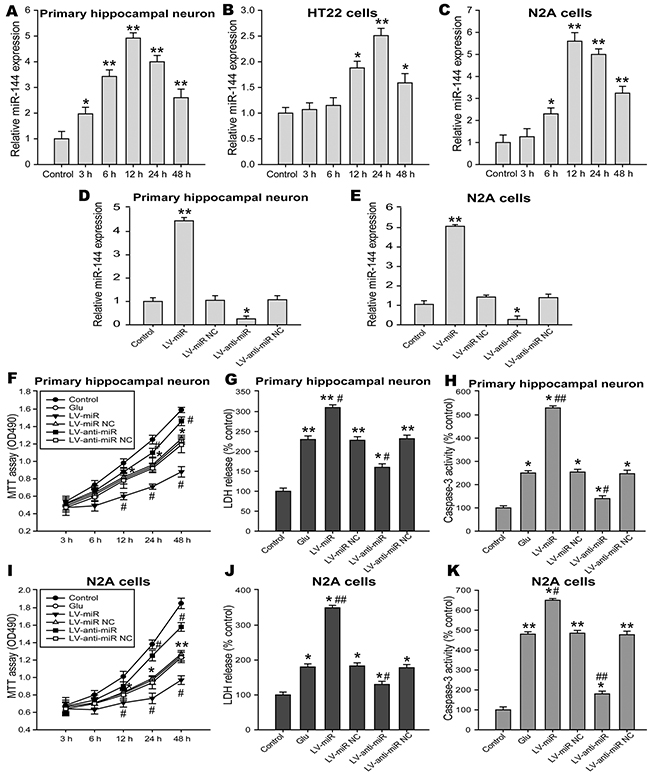 Figure 6: Effects of miR-144 on glutamate-induced neuron injury in vitro. (A-C) Ectopic expression of miR-144 in primary hippocampal neuron, HT22 and N2A cells exposed to glutamate detected by real-time PCR and normalized to the expression of U6. (D, H) The infection efficiency of hippocampal neuron and N2A cells was determined by real-time PCR. (E-G) Effects of regulating cell miR-144 on cell viability (E), LDH release in the culture supernatant (F) and cell apoptosis (G) in primary hippocampal neuron. Cell viability, LDH release and cell apoptosis were evaluated by MTT assay, LDH Kit and caspase-3 activity respectively. (I-K) Effects of regulating cell miR-144 on cell viability (I), LDH release (J) and cell apoptosis (K) in the N2A cells. The data are represented as mean ± SD from three independent experiments. *P< 0.05, **P< 0.01 versus the control group, #P< 0.05, ##P< 0.01 versus the glutamate group.