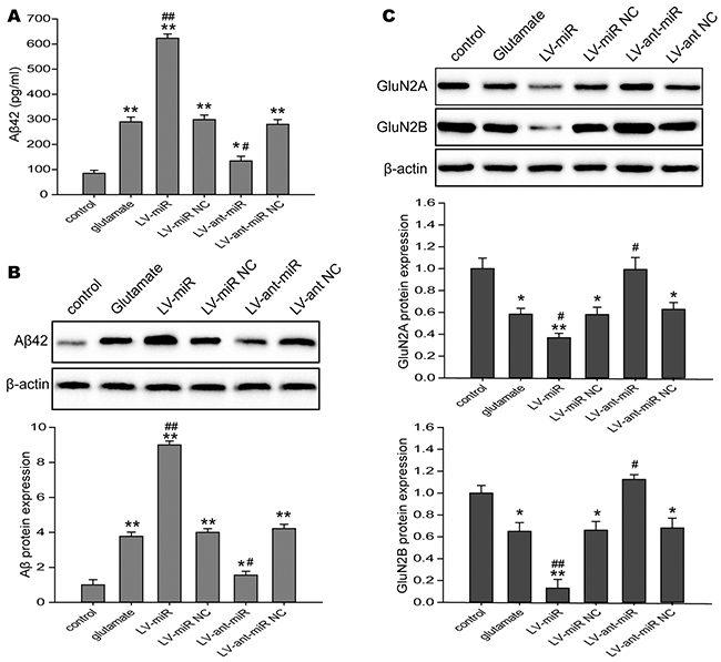 Figure 7: The impacts of regulating cell miR-144 on cognitive-related proteins in the N2A cells. (A) The levels of Aβ42 in the culture measured using ELISA in N2A cells transfected with LV-miR-144 and LV-anti-miR-144. (B) The Western blots analysis of Aβ42 protein levels in N2A cells. β-actin served as an internal control. (C) Representive bands and quantitative analysis of NMDAR subunits in the N2A cells. The data are represented as mean ± SD. *P< 0.05, **P< 0.01 versus the control group, #P< 0.05, ##P< 0.01 versus the glutamate group.