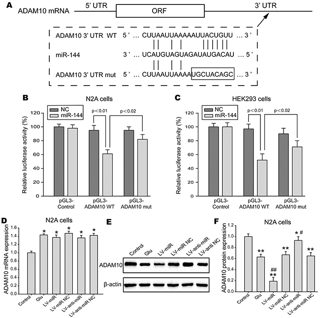 Figure 9: ADAM10 was direct downstream target for miR-144. (A) Schematic diagram of the miR-144 putative binding sites and corresponding mutant sites of the ADAM10 mRNA 3’-UTR. (B-C) The interaction between miR-144 and 3’-UTR of ADAM10 mRNA was detected relative luciferase activity assay in the N2A cells (B) and the HEK293 cells (C). The WT or mut ADAM10 3’-UTR was co-transfected with LV-miR-144 and negative control. The luciferase activity was significantly decreased in cells co-transfected with WT ADAM10 3’-UTR and LV-miR-144, but not in cells co-transfected with mut ADAM10 3’-UTR and LV-miR-144. (D-F) Real-time PCR and Western blot analysis to quantify the mRNA and protein levels of ADAM10 in the N2A cells. Each experiment was performed at least three times, and each sample was analyzed in triplicate. The data presented mean ± SD.*P< 0.05, **P< 0.01 versus the control group, #P< 0.05, ##P< 0.01 versus the glutamate group.