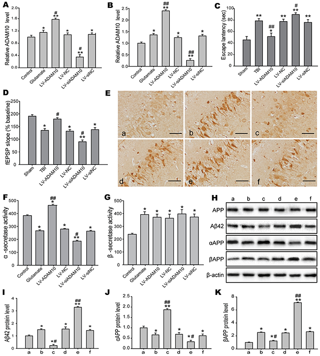 Figure 10: ADAM10 modulated the production of the Aβ peptides involved in cognitive impairments. (A-B) Real-time RCR analysis was performed to assess the overexpresion or knockdown efficiency in the hippocampal CA1 region of rats (A) and the N2A cells (B). (C-D) Effects of gain and loss of ADAM10 on TBI-induced cognitive dysfunction, including the hippocampus-dependent spatial learning and memory measured by MWM (C) and LTP recorded by electrophysiology (D). (E) Representive images of Aβ42 deposition in the rat hippocampal CA1 region by immunohistochemical staining at 24 h post-injury. Bar, 20μm. (F-G) The α-secretase and β-secretase activity in the culture medium of the N2A cells using an activity assay at 12 h post-injury. (H) Western blot analysis of APP, Aβ42, αAPP, and βAPP protein expression levels in the N2A cells. (I-K) Densitometric analysis of Aβ42 (I), αAPP (J), and βAPP (K) protein with bands corresponding to β-actin. a: sham, b: TBI, c: LV-ADAM10, d: LV-NC, e: LV-siADAM10; f: LV-si NC. Data are expressed as mean ± SD. *P< 0.05, **P< 0.01 versus the sham or control group, #P< 0.05, ##P< 0.01 versus the TBI or glutamate group.