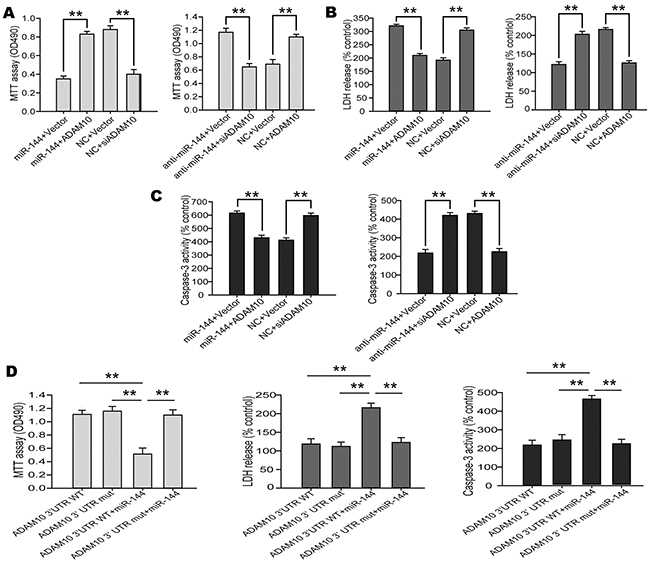 Figure 11: miR-144 involved in the regulation of TBI-induced brain injury by suppressing ADAM10 expression. (A-C) Overexpression of ADAM10 blocked miR-144-induced neuron injury including cell viability (A), LDH release (B) and caspase-3 activity (C) in the N2A cells, and the silencing of ADAM10 by siRNA mimicked the effects of miR-144. (D) miR-144 promoted TBI-induced brain injury though suppressing of ADAM10 expression. The data are showed as mean ± SD from three independent experiments.