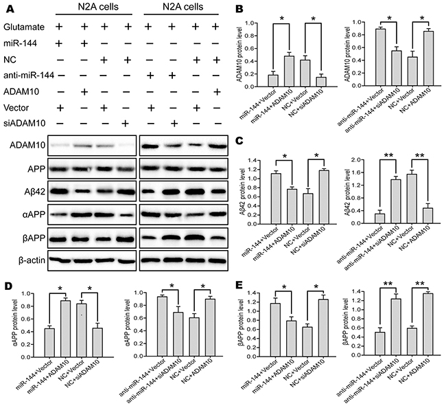 To further verify the biological roles of miR-144 in regulating ADAM10 expression, the mRNA and protein levels of ADAM10 were quantified in gain and loss-function model of miR-144 in vitro. As expected, the results revealed that the protein level of ADAM10 was markedly decreased by miR-144 overexpression, in contrast, significantly increased by miR-144 inhibition in the N2A cells (Figure 9E and 9F). Whereas no significant change was observed in the mRNA levels of ADAM10 (Figure 9D). Suggesting that miR-144 negatively regulated ADAM10 expression by translational repressing rather than mRNA degradation. Thus, these results indicated that miR-144 could directly binding to ADAM10 3’-UTR to negatively regulate ADAM10 protein expression through promoting degradation of ADAM10 mRNA.