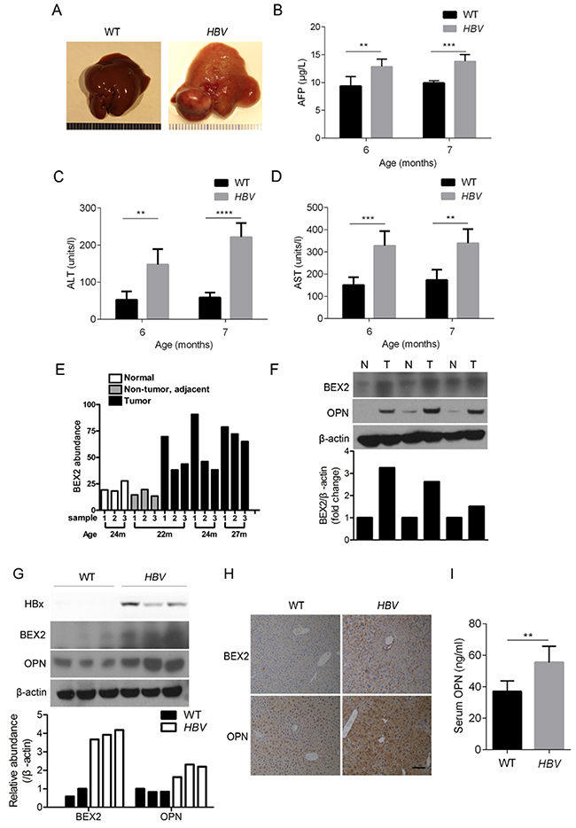 Figure 1: BEX2 and OPN are increased in liver tissues of HBV transgenic mice. (A) Macroscopic appearance of livers from 14-month-old wide-type (WT) and HBV transgenic mice. (B-D) The levels of AFP (B), ALT (C), and AST (D) in the serum from WT and HBV transgenic mice at 6 months and 7 months (n=5). **P < 0.01, ***P < 0.001, ****P < 0.0001. (E) Analysis of the mRNA abundance of BEX2 in liver tissues from HCC mouse model by using mRNA microarray data from the Gene Expression Omnibus database (GEO accession number GSE2127). m: month. (F) Liver tumor tissues (T) and the adjacent liver tissues (N) from 14-month-old HBV transgenic mice were lysed and then subjected to immunoblotting (upper panel). The relative quantitation of BEX2 by scanning densitometry analysis upon normalization for β-actin (lower panel). (G) Liver tissues dissected from 4-month-old WT and HBV transgenic mice were lysed and then subjected to immunoblotting (upper panel). The relative quantitation of BEX2 and OPN by scanning densitometry analysis upon normalization for β-actin (lower panel). (H) Immunohistochemical analysis of liver tissues from 4-month-old WT and HBV transgenic mice with antibodies against BEX2 and OPN. Representative images were presented. Scale bar, 100 μm. (I) ELISA analysis of OPN levels in the serum from 4-month-old WT and HBV transgenic mice (n=6). **P < 0.01.