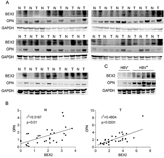 Figure 2: Enhanced expression of BEX2 and OPN in human HCC specimens. (A) Liver tumors (T) and the adjacent tissues (N) from 30 HCC patients were subjected to immunoblotting for analysis of BEX2 and OPN expression. (B) Statistical analysis of the correlation between BEX2 and OPN in human HCC specimens. (C) HBV-negative (HBV-) and HBV-positive (HBV+) HCC specimens were subjected to immunoblotting for analysis of BEX2 and OPN expression.