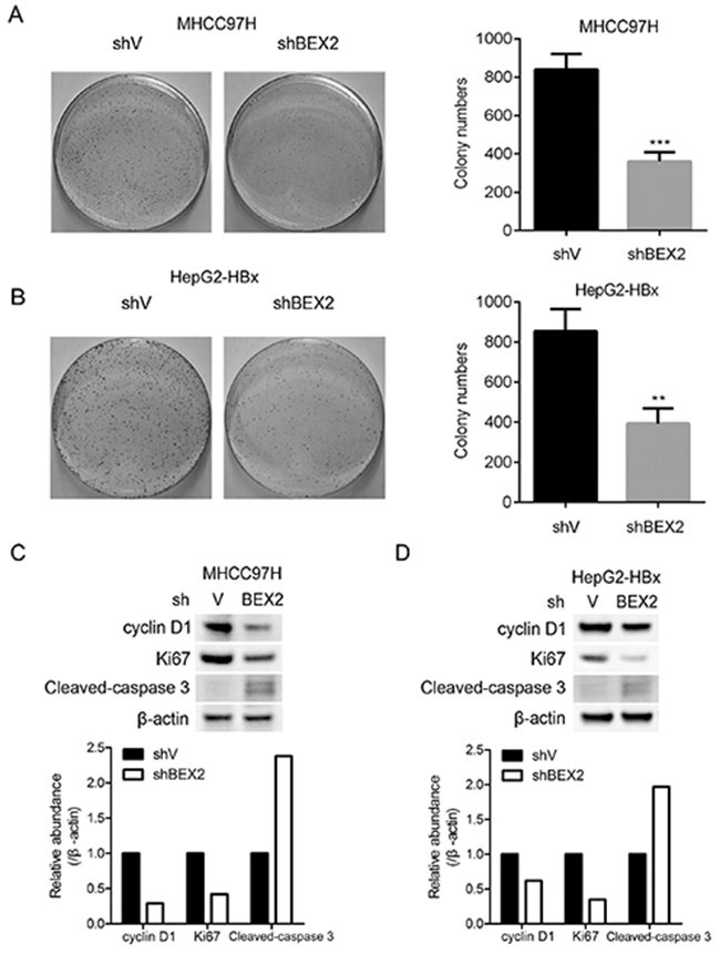 To investigate the role of BEX2 in HBV-induced HCC, we silenced BEX2 in HCC cells and examined their colony formation. Knockdown of BEX2 significantly inhibited the colony formation of MHCC97H cells (Figure 4A). Likewise, depletion of BEX2 markedly suppressed the colony formation of HepG2 cells with ectopically expressed HBx (Figure 4B). In addition, silencing BEX2 led to down-regulation of cyclin D1 (a key regulator of cell cycle) and Ki-67 (a proliferation marker), and up-regulation of cleaved-caspase 3 (an apoptosis marker) in MHCC97H cells and HBx-overexpressed HepG2 cells (Figure 4C and 4D). Therefore, blockage of BEX2 inhibited the growth of HCC cells partially through induction of cell cycle arrest and activation of apoptosis.