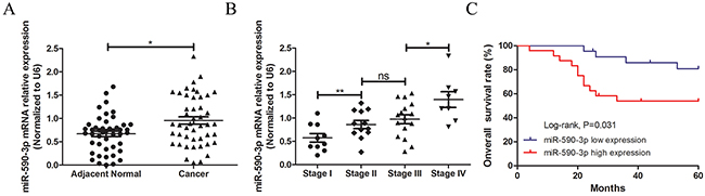 Figure 1: Statistical comparisons of the miR-590-3p expressions in tumor tissues and normal colorectal mucosae. miR-590-3p expression level was detected usingqRT-PCR assay in a total of 46 patients with CRC (normalized to GAPDH). (A) miR-590-3p was highly expressed in CRC tissues, compared with adjacent normal ones. (B) miR-590-3p expression was displayed difference in different TNM stages of 46 CRC tissues. (C) Survival analysis of Log-rank assay and Kaplan-Meier curve were carried out and showed that higher miR-590-3p expression was associated with lower 5-year survival rate of patients with colorectal cancer. All graphs summarize the data from three independent experiments. ns referred to no significance, *P<0.05, **P<0.01, compared with control, using Student’s t-test.