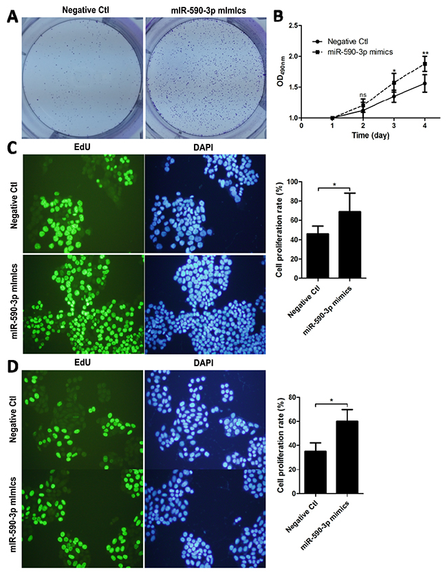 Figure 2: miR-590-3p mimics facilitate the proliferation of CRC cells. HCT116 cells were transfected with the indicated miRNA mimics or plasmids for 24 h. (A) Clone formation experiments were employed between miR-590-3p mimics group and negative control group. (B) The transfected HCT116 cells were cultured for 4 days to perform MTT test. (C),(D) EdU staining and DAPI staining were detected in HCT116 and SW480 after transfection of miR-590-3p mimics or negative mimic control for 48h. Representative images (left) and quantification of migrating cells (right) are shown. All graphs summarize the data from three independent experiments. *P<0.05, **P<0.01, compared with control, using Student’s t-test.