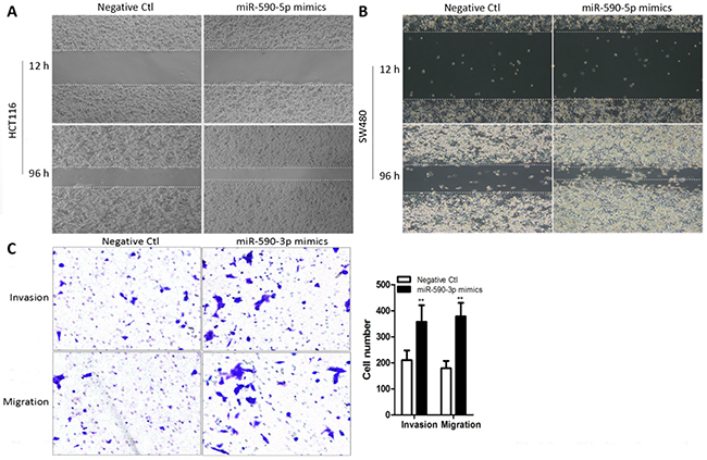 Figure 3: Over-expressed miR-590-3p promotes cell invasion and migration in colon cancer cells. miR-590-3p mimics or negative control were transfected into HCT116 cells and SW480 cells, respectively. These transfected cells were cultured for subsequent assays. (A),(B) The wound healing assay was performed to evaluate migration ability of both HCT116 cells and SW480 cells. (C) Transwell assays were carried out to assess effect of miR-590-3p on invasion and migration capacity. The cell number of invasion and migration were presented in the right panel. All graphs summarize the data from three independent experiments. **P<0.01, compared with control, using Student’s t-test.