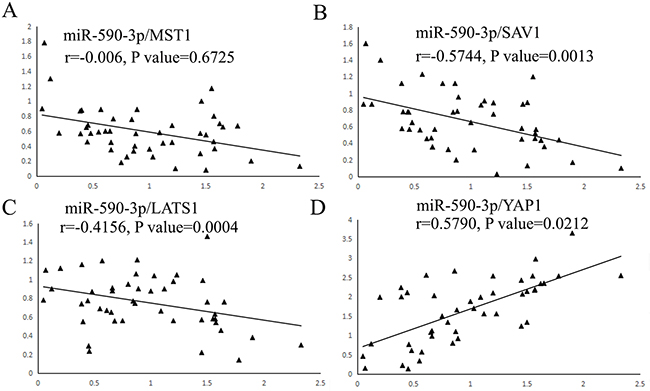 Figure 5: Scatter plots showing the statistical association between miR-590-3p and expression levels of key molecule mRNAs of Hippo pathway. A total of 46 cases of CRC tissues and adjacent normal tissues were fresh quick frozen tissues. They were used to analyze the correlation between miR-590-3p expression and core factors of Hippo pathway by qRT-PCR assay. (A) miR-590-3p expression level was not related with MST1 mRNA expression in CRC tissues. (B),(C) The negative association between miR-590-3p and SAV1 and LATS1 mRNA expression were demonstrated respectively. (D) The positive association between miR-590-3p and YAP1 mRNA expression was demonstrated.