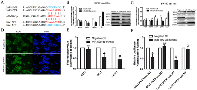 Figure 6: miR-590-3p inhibits Hippo pathway by targeting SAV1 and LATS1 in CRC. (A) Bioinformatics analysis was performed and showed that 3’UTR of SAV1 and LATS1 mRNA had binding sequence of miR-590-3p. (B),(C) HCT116 cells or SW480 cells were transfected with miR-590-3p mimics or negative control and cultured for 48 hours. QRT-PCR and western blotting assay were carried out and the results indicated that over-expressed miR-590-3p inhibited expressions of LATS1 and SAV1, and promoted YAP1 expression (Normalized to GAPDH) in HCT116 cells or SW480 cells, respectively. (D) Immunofluorescent test was employed and the representative image demonstrated that over-expressed miR-590-3p improved the YAP1 expression in cell nuclear. (E),(F) Luciferase assay showed that miR-590-3p mimics significantly inhibited the luciferase activity of SAV1 or LATS1, meanwhile, it had less effect on the mutated form of SAV1 or LATS1 (Normalized to Rellina). All graphs summarize the data from three independent experiments. ns referred to no significance, *P<0.05, **P<0.01, compared with control, using Student’s t-test.