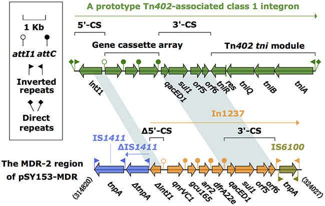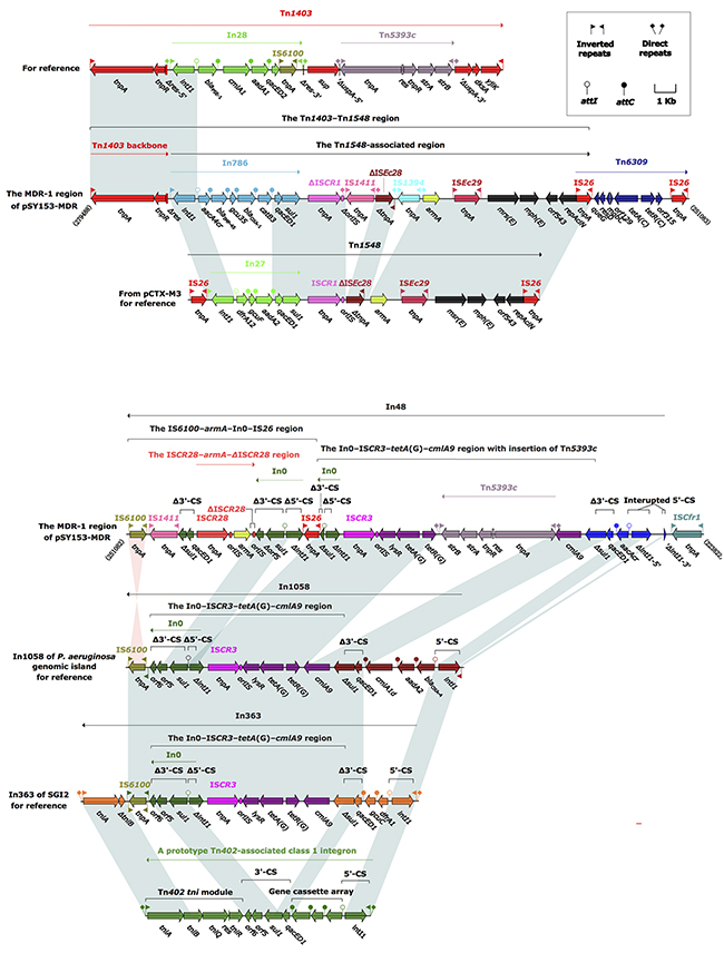 The Tn1403–Tn1548 region of pSY153-MDR was composed of Tn1403 backbone remnant IRL–tnpAR–∆res, and a 19.0-kb Tn1548-associated region. Compared with Tn1548, the Tn1548-associated region of pSY153-MDR had undergone several evolutionary events: i) deletion of the IS26 at the 5’-flank; ii) replacement of In27 with In786; and iii) insertion of IS1411 and IS1394 upstream of ΔISEc28 and armA, respectively. In786 consisted of an inverted repeat at the integrase end (IRi), a 5’-conserved segment (5’-CS:intl1 (integrase)–attI1 (IntI1-recognizing recombination site)), a gene cassette array (GCA; organized as aacA4cr (aminoglycoside and quinolone resistance), blaIMP-45, gcu35 (unknown function), blaOXA-1 (β-lactam resistance), catB3 (chloramphenicol resistance), and a 3’-CS (qacED1 (quaternary ammonium compound resistance)–sul1 (sulfonamide resistance)), but lacked an inverted repeat at the tni end (IRt). The Tn1403–Tn1548 region was likely generated from homologous recombination between the Tn1403-like and Tn1548-like transposons, with In786 as the common component.