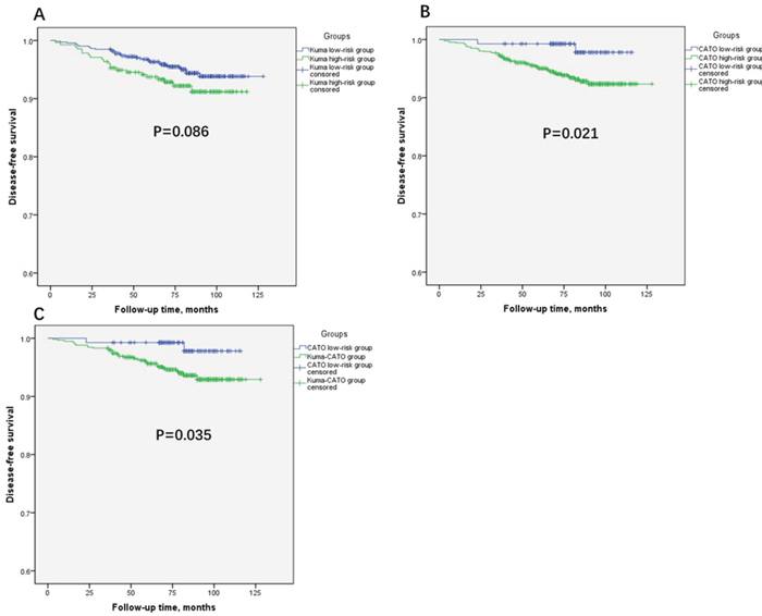 According to the grouping definition, comparisons were made between the Kuma low- and high-risk PTMC groups and between the CATO low- and high-risk PTMC groups. Patients in the Kuma low-risk PTMC group had a significantly lower incidence of some potentially dangerous characteristics than patients in the Kuma high-risk PTMC group, such as multifocal lesions (14.8% vs. 21.7%, respectively; p < 0.05) and central lymph node metastasis (CLNM) (30.9% vs. 49.8%, respectively; p < 0.05), but not external invasion (6.5% vs. 10.1%, respectively; p = 0.060). We also found obvious differences in all pathological characteristics (multifocal lesions, external invasions, and CLNM) between the CATO low- and high-risk PTMC groups. The results of these comparisons were shown in Table 2. Evaluation of surgical complications showed that the ratio of adverse events remained low in all surgery patients and that no significant differences were present between the groups (data not shown).