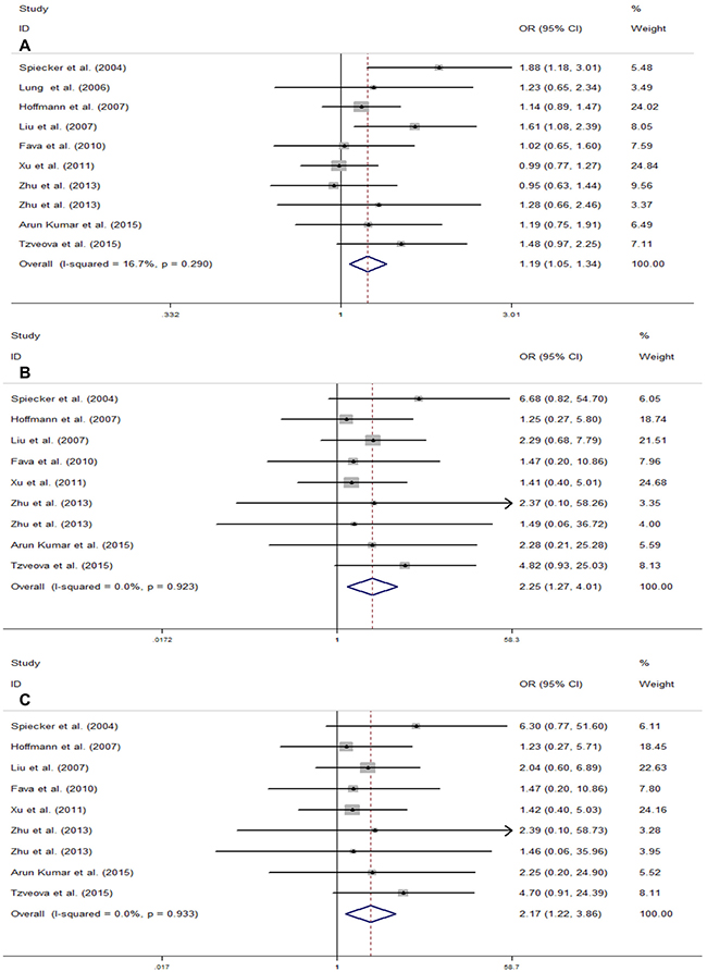 Figure 2: Meta-analysis for the association of CYP2J2 G-50T polymorphism and CAD risk in total population. (A) Allele genetic model (T vs.G); (B) Homozygote genetic model (TT vs. GG); (C) Recessive genetic model (TT vs. GT + GG). For each study, the estimation of OR and its 95% CI are plotted with a box and a horizontal line. ◊, pooled ORs and its 95% CIs.