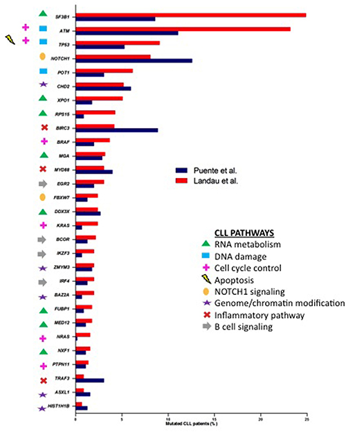 Figure 2: Percentages of samples affected by mutations in common CLL drivers from Puente et al. [9] (blue) and Landau et al. [10] (red) studies. Genes were marked with different symbols according to the biological pathways involved.
