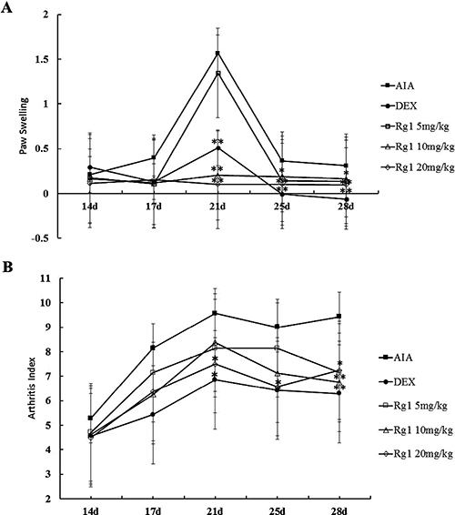 Figure 2: Effects of Rg1 on paw swelling and the arthritis index in AIA rats. SD rats were immunized with complete Freund’s adjuvant (CFA). The rats were then given Rg1 or DEX from day 15 to day 28. The paw swelling (A) and arthritis indexes (B) were evaluated on days 14, 17, 21, 25, and 28. Data are expressed as mean ± SD (n = 7 for AIA group, 7 for DEX group, 7 for Rg1 5 mg/kg group, 8 for the Rg1 10 mg/kg group, 8 for Rg1 20 mg/kg group). *P < 0.05 and **P < 0.01 versus AIA.
