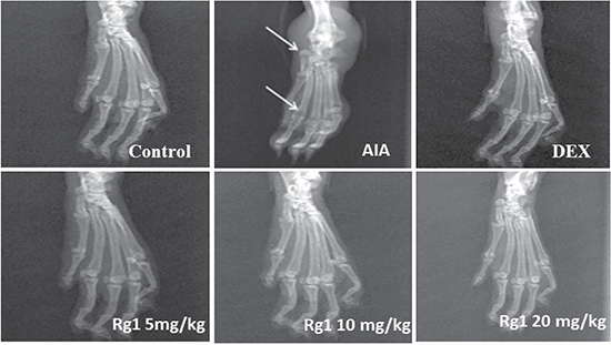 Figure 3: Effects of Rg1 on radiography of the joints of AIA rats. SD rats were immunized with complete Freund’s adjuvant (CFA). The rats were then given Rg1 or DEX from day 15 to day 28. On day 28, rats were anesthetized with chloral hydrate, then placed on a radiographic box at a distance of 90 cm from the X-ray source. Radiographic analysis were performed by X-ray machine.