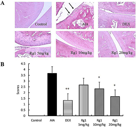 Compared with the control group rats, bone matrix resorption, osteophyte formation and bone erosion can be observed in the joints of AIA group rats. After Rg1 treatment at doses of 10 and 20 mg/kg, bone erosion and the degree of arthritis were significantly reduced (Figure 3).