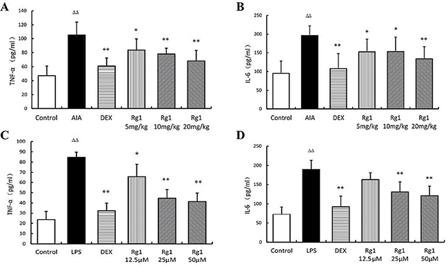 Figure 5: Effects of Rg1 on TNF-α and IL-6 levels in vivo and in vitro. (A–B) Effects of Rg1 on TNF-α and IL-6 levels in AIA rats (n =7 for each group); (C–D) Effects of Rg1 on TNF-α and IL-6 levels in RAW264.7 cells treated with LPS (n = 5 for each group). Data are expressed as mean ± SD. *P < 0.05 and **P < 0.01 versus AIA or LPS; ΔΔP < 0.01 versus control.