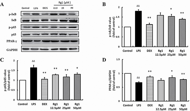 Figure 7: Effects of Rg1 on p-IκBα, p-p65, and PPAR-γ protein expression in RAW264.7 cells treated with LPS. (A) Western blot bands; (B) p-IκBα expression; (C) p-p65 expression; (D) PPAR-γ protein expression. Data are expressed as mean ± SD, n = 3 for each group. *P < 0.05 and **P < 0.01 versus LPS; ΔΔP < 0.01 versus control.