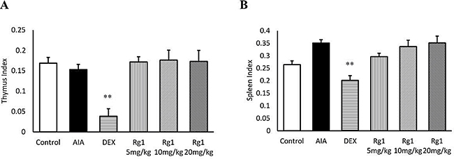 The index of thymus and spleen in DEX administration rats was markedly lower than in AIA rats (P < 0.01). However, rats given Rg1 showed no significant differences from AIA rats (Figure 8).