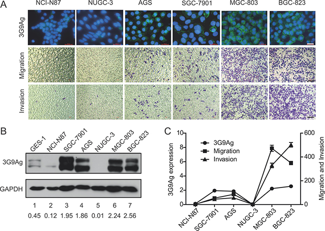 Figure 1: The expression of 3G9Ag is related to migration and invasion ability in GC cells. (A) Immunofluoresence stained with 3G9 mAb showing the expression of 3G9Ag in gastric cancer cell lines (NCI-N87, NUGC-3, AGS, SGC-7901, MGC-803 and BGC-823) (up panel). Transwell chamber assay without or with Matrigel showed the migration and invasion of gastric cells (median and low panel). (B) The expression of 3G9Ag in normal gastric epithelial GES-1 cells and gastric cancer cell lines was examined by Western blot. Quantitative results are illustrated under the blots. (C) Quantitative results of Western blot and migration and invasion assays using Transwell chamber are illustrated in C.
