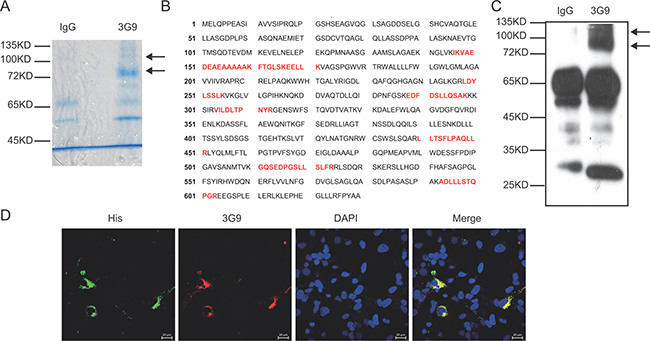 Figure 2: Identification of the antigen targeted by mAb 3G9. (A) The whole-cell lysate of MGC-803 cells was immunoprecipitated by mAb 3G9, and separated by SDS-PAGE followed by Coomassie brilliant blue staining. (B) The bands specific to 3G9 were subjected to mass spectrometric analysis, and the peptide sequences obtained that match SLC3A2 (red text in B) were illustrated. (C) Immunoblot analysis of the immunoprecipitates with 3G9. (D) COS-7 cells expressing fusion protein SLC3A2-His were double immunofluoresence stained with 3G9 mAb (red) and anti-His antibody (green), and the nuclei were stained by DAPI.