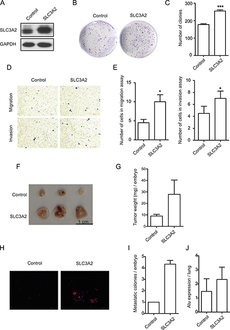 Figure 3: Overexpression of SLC3A2 promoted the migration and invasion in NCI-N87 cells. (A) Western blot for SLC3A2 and GAPDH in GFP and SLC3A2 overexpressing NCI-N87 cells. (B, C) The effect of SLC3A2 overexpression on colony formation in NCI-N87 cells was examined. (D, E) Transwell chamber assay without or with Matrigel showed that overexpression of SLC3A2 promoted cell migration and invasion. Quantitative results are illustrated in E. (F, G) The effect of SLC3A2 overexpression on tumor growth was measured by CAM assay in vivo. Weights of tumor were measured and showed in G. (n = 3) (H, I). Lung metastasis was identified by Dil-staining cell colonies under a fluorescence microscope, and the quantitative results are illustrated. (J) Intravasation of NCI-N87 cells into chicken embryo lung tissues was determined by human specific Alu sequence expression. *P < 0.05 and ***P < 0.001.