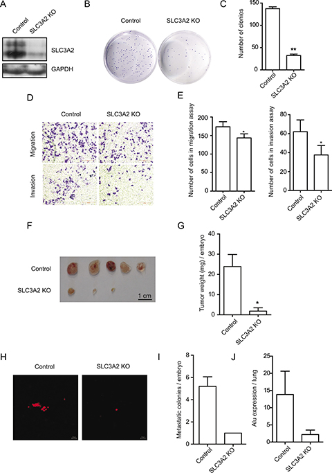 Figure 4: SLC3A2 deficiency suppressed the migration and invasion in BGC-823 cells. (A) Western blot for SLC3A2 and GAPDH in control and CRISPR-mediated SLC3A2 knockout BGC-823 cells. (B, C) The effect of knockout of SLC3A2 on colony formation in BGC-823 cells was examined. (D, E) Transwell chamber assay without or with Matrigel showed that SLC3A2 deficiency suppressed cell migration and invasion. Quantitative results are illustrated in E. (F, G) The effect of knockout of SLC3A2 on tumor growth was measured by CAM assay in vivo. Weights of tumor were measured and showed in G. (n = 5) (H, I). Lung metastasis was identified by Dil-staining cell colonies under a fluorescence microscope, and the quantitative results are illustrated. (J) Intravasation of BGC-823 cells into chicken embryo lung tissues was determined by human specific Alu sequence expression. *P < 0.05 and **P < 0.01.