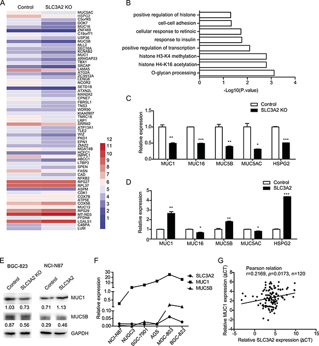 Figure 5: Knockout of SLC3A2 downregulated mucin genes expression. (A) Heatmap of differential gene expression between SLC3A2 knockout BGC-823 cells and control cells. (B) Gene ontology analysis of downregulated genes in SLC3A2 knockout cells. (C) qRT-PCR validation of reduced expression of a subset of genes in SLC3A2 knockout BGC-823 cells and control cells. (D) qRT-PCR analysis showing the upregulation of selected genes in SLC3A2 overexpressing NCI-N87 cells compared to control cells. (E) Western blot showing the expression of MUC1 and MUC5B in SLC3A2 knockout BGC-823 cells and SLC3A2 overexpressing NCI-N87 cells. (F) The expression levels of MUC1, MUC5 and SLC3A2 in GC cell lines were determined by qRT-PCR. (G) The correlation between the expression level of MUC1 and SLC3A2 mRNA in GC samples (n = 120 cases). *P < 0.05, **P < 0.01, and ***P < 0.001.