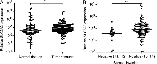 Figure 6: Relationship between SLC3A2 expression and clinicopathological features. (A) SLC3A2 expression was upregulated in gastric carcinoma tissues compared with the nontumorous tissues. (B) The expression levels of SLC3A2 were compared between the gastric carcinoma tissues with or without serosal invasion. The expression of SLC3A2 were determined by qRT-PCR and normalized to GAPDH. *P < 0.05 and **P < 0.01.