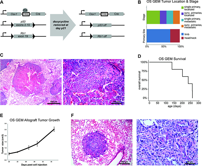 Figure 2: Genetically engineered mouse model of osteoblastic osteosarcoma (OS GEM). (A) Overview of conditional mouse model. OS GEMM pups received doxycycline through postnatal day 21. In the absence of doxycycline, Cre is expressed under the Osx1 promoter and p53 and Rb1 are floxed. TRE = tetracycline-responsive element; tTA = tetracycline transactivator protein. (B) Distribution of site of tumor (n = 7 primary tumors) and whether the mice had single or multiple primary tumors and/or metastases at time of death (n = 5 mice). Sync. = synchronous. (C) H&E of OS GEM U61236 lung metastasis at low magnification (left, scale bar = 0.5mm) and higher magnification (right, scale bar = 100 μm). (D) Kaplan-Meier survival curve for OS GEM (n = 5). Median survival until tumor-specific death was 237 days. (E) Injection of 106 OS GEM U61323L cultured cells into a hind limb results in rapid tumor development with disseminated metastases visible at time of necropsy. (F) H&E of one of these lung metastases at low magnification (left, scale bar = 200 μm) and higher magnification (right, scale bar = 50 μm).